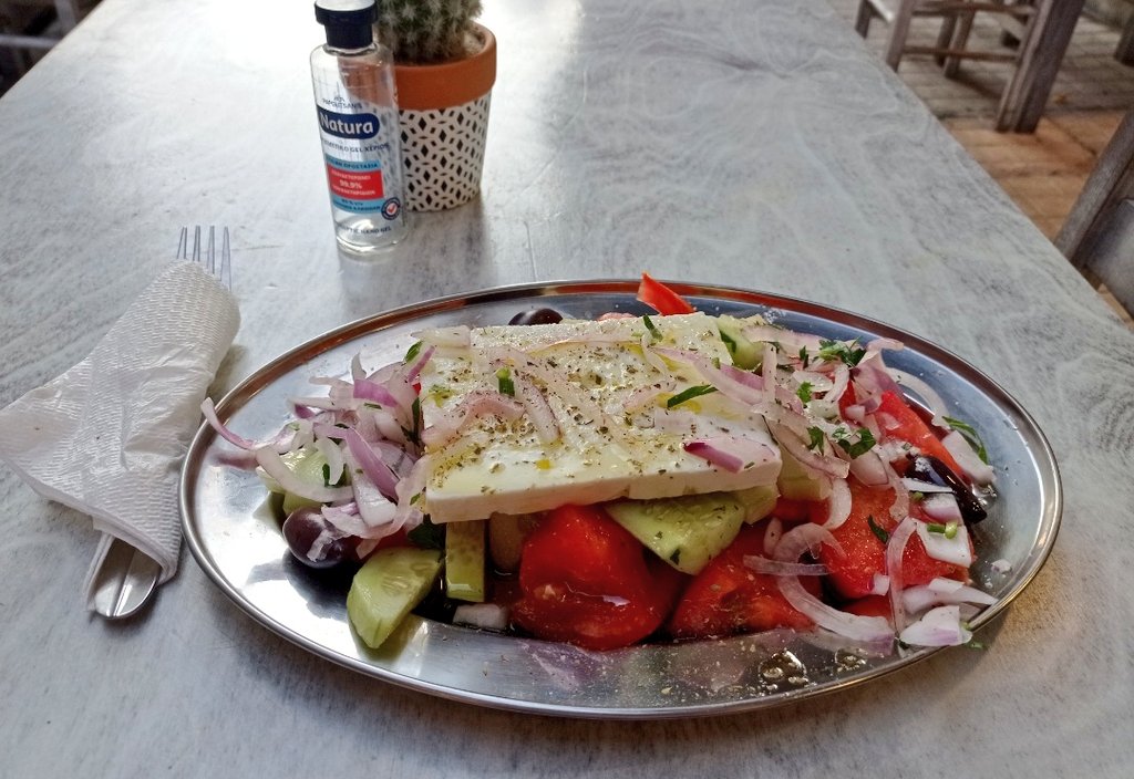 Салат, который мы привыкли называть греческим, здесь называется Деревенский (Χωριάτικη σαλάτα)