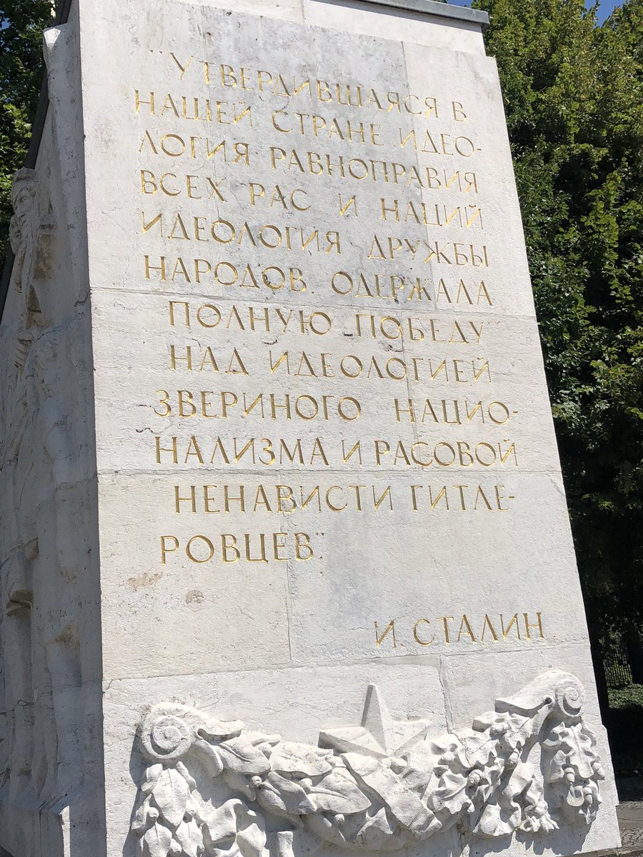В Берлине много памятников, оставшихся со времён ГДР. Многие из них заброшены и раскрашены граффити, но вот памятник советским солдатам, топчущим гигантские свастики, до сих пор как новенький посередине парка. Сегодня мимо проходила и нашла внезапную цитатку на камне. pic.twitter.com/C1LsZtw9eW